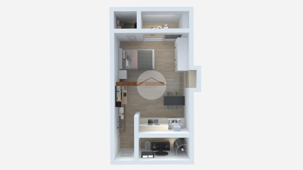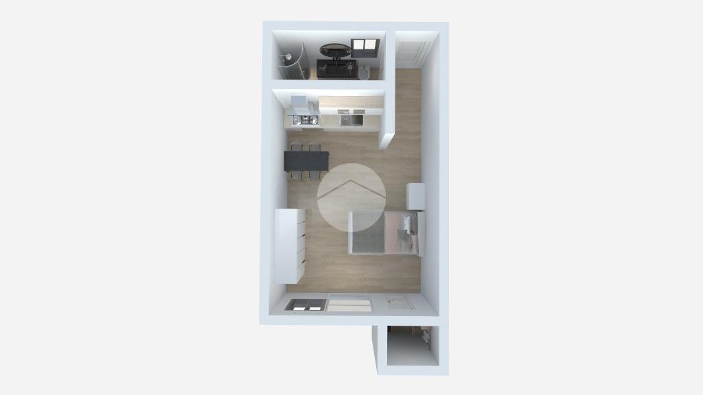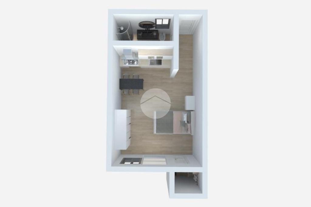 Monolocale al primo piano con ascensore, unico ambiente con cucinotto, ripostiglio, bagno finestrato con box doccia e balcone.