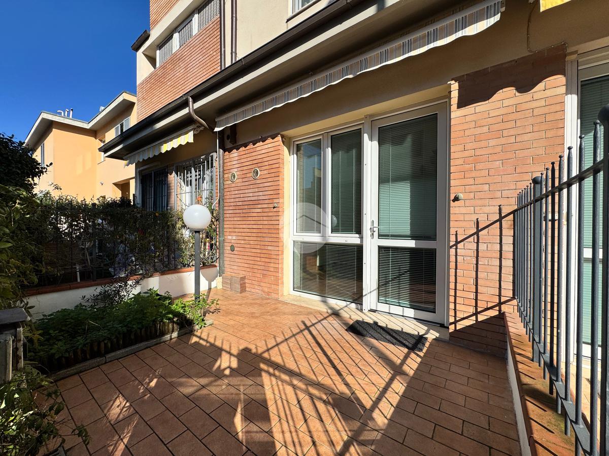 Dalla resede privata di 14 mq si accede, tramite portafinestra, alla luminosa zona giorno che comunica con la camera da letto.
